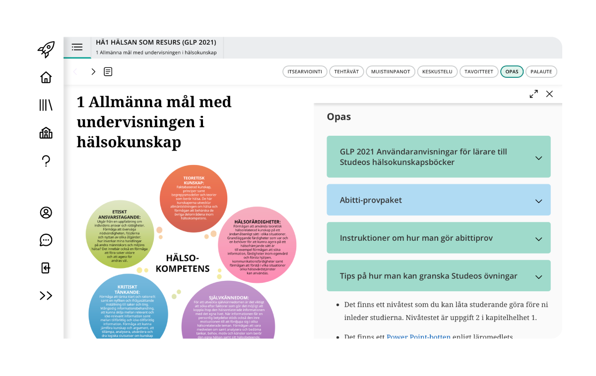 - Uppgifterna är indelade enligt hälsokompetensens delområden och uppmanar de studerande till både interaktion och självständigt arbete.