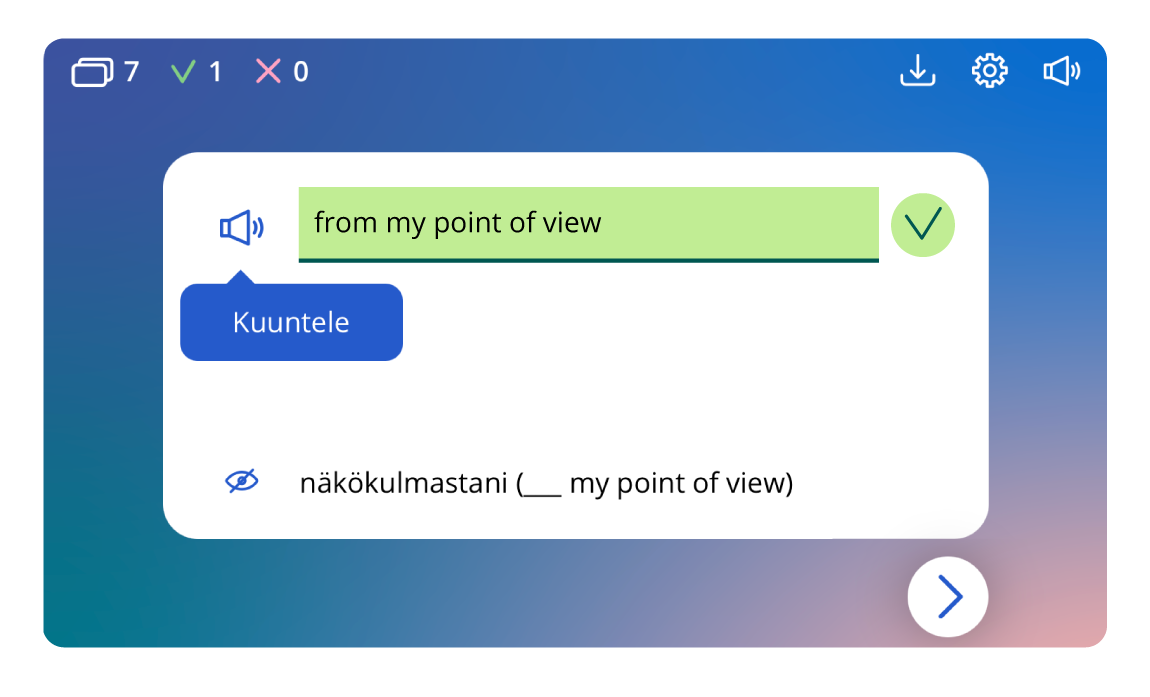 • Sanojen oppimista ja kertaamista tukee sanastoista löytyvä sanojen piilotustoiminto.
